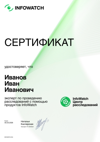 После прохождения офлайн обучения выдается фирменный сертификат InfoWatch о прохождении обучения
